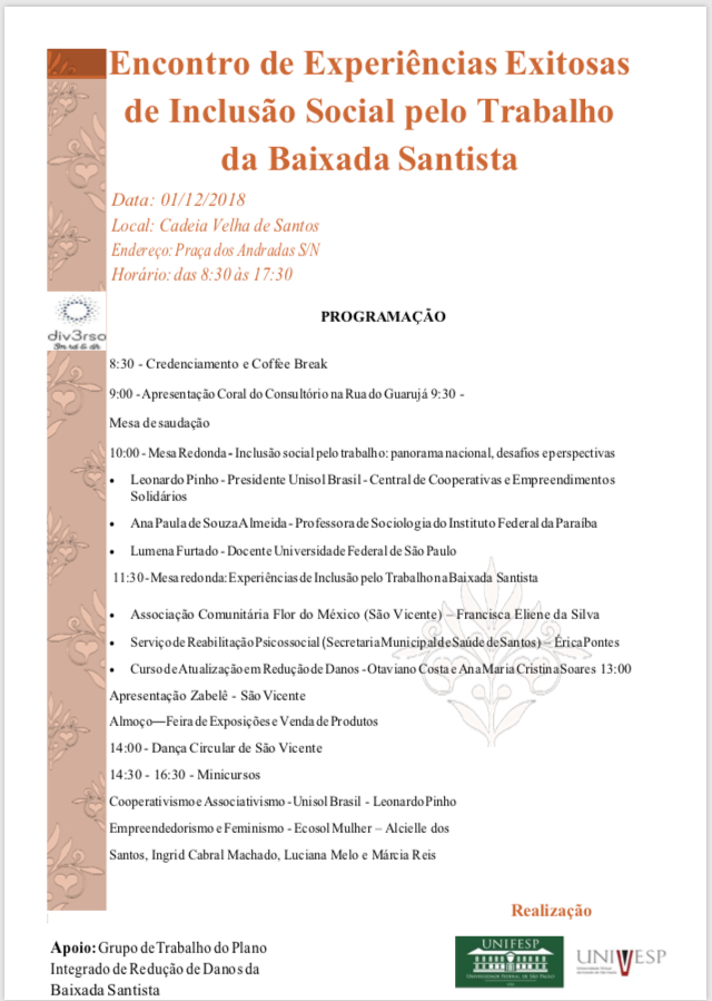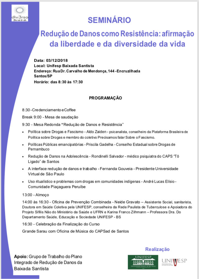 Já o Seminário, discutirá diferentes interfaces da Redução de Danos e sua potencialidade em fazer a liberdade e a vida resistirem. A solenidade finaliza uma capacitação que teve início em setembro e segue até dezembro, com o objetivo fortalecer políticas públicas sobre saúde coletiva, saúde mental e uso de drogas - voltadas para a população em situação de vulnerabilidade social. O curso envolveu profissionais dos nove municípios da Baixada Santista e acontece uma vez por semana na Unifesp - Campus Baixada Santista (Rua Carvalho de Mendonça, nº 144, Vila Belmiro, Santos). As aulas foram realizadas no âmbito do Grupo de Estudos, Pesquisa e Extensão - “Diverso: Saúde Mental, Redução de Danos e Direitos Humanos” - e tem carga horária de 60 horas e certificado.